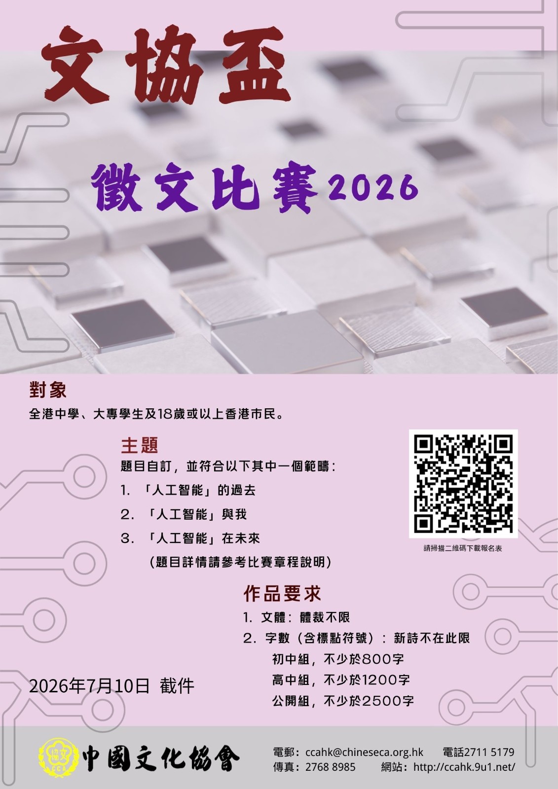 比賽結果將於2026年9月22日,在中國文化協會網站(http://chineseca.org.hk) 公佈,並電郵予各組別之得獎者。